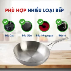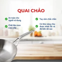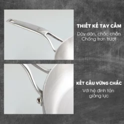 Thiết Kế Sang Trọng: Bề mặt ngoài được đánh bóng gương, mang đến vẻ đẹp hiện đại và dễ dàng vệ sinh. Thiết kế thành chảo cao giúp hạn chế dầu mỡ bắn ra ngoài, phù hợp để chế biến các món xào, rán.