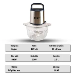 Máy xay thịt Engler đa năng EL5145 dung tích 2L công suất lớn 500W cối thuỷ tinh với khả năng đa dạng, hiệu suất tuyệt vời và thiết kế thông minh, sản phẩm này hứa hẹn sẽ đem lại những trải nghiệm ẩm thực thú vị và tiện lợi cho bạn và gia đình.